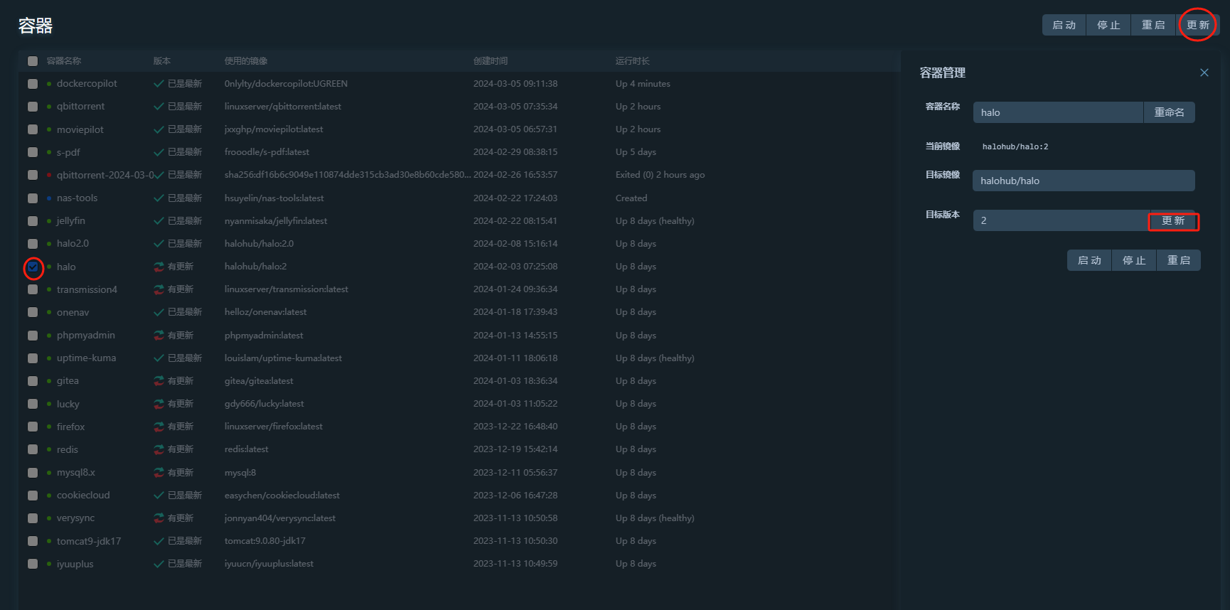 打开详情,点击目标版本右侧的更新按钮进行更新;批量更新:选中需要更新的容器,点击