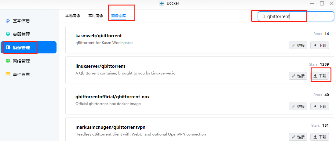 在输入框输入镜像关键词后点击回车按键即可搜索,选择需要的镜像点击下载即可,但是只能拉取