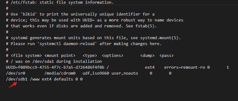 /dev/sdb1 /www ext4 defaults 0 0。第一列为
