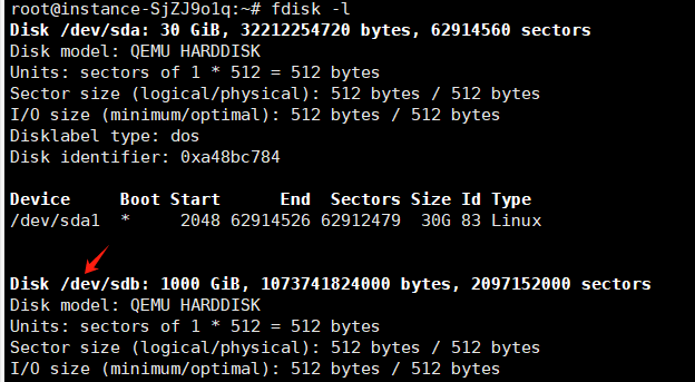 2. 输入fdisk -l命令,查看所有磁盘的分区情况。