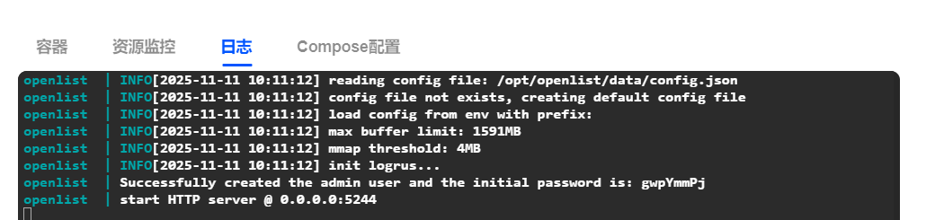 在容器首次启动时,系统日志中会显示Successfully created the admin user and the initial password is: gwpYmmPj。当前默认账户为 admin,初始密码为 gwpYmmPj。