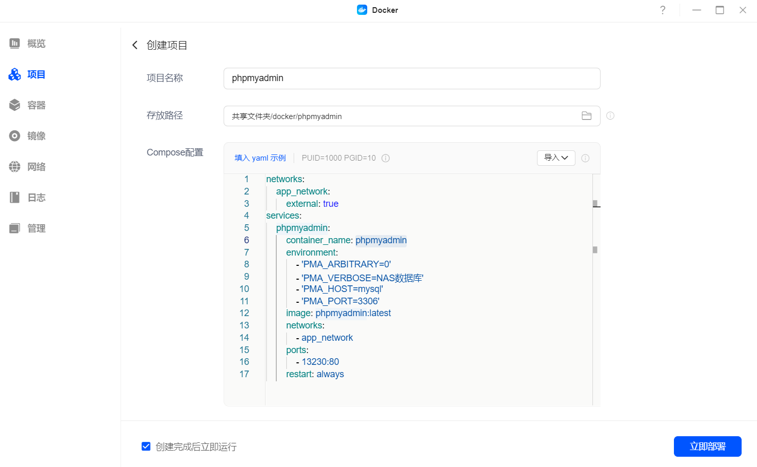 mysql和phpmyadmin均使用app_network网络,注意不能是host网络;- PMA_HOST=mysql:其中mysql为同网络下部署的mysql服务名;- PMA_PORT=3306:3306为mysql容器的默认端口,mysql教程中容器本身没有映射任何端口作为外部访问端口;- 13230:80:左侧端口号为自定义的端口号,右侧端口号固定为80,不能修改。