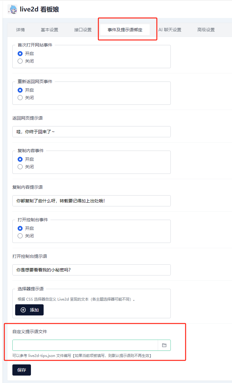 事件及提示语绑定标签栏;自定义提示语文件:使用在线链接:输入