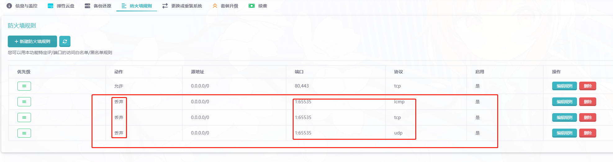 1:65535端口,源地址0.0.0.0/0,协议TCP、UDP、ICMP三组协议规则,动作丢弃,封禁所有端口;优先级为由上至下规则,因此需要开放哪些端口,单独配置出来且排序靠前即可。