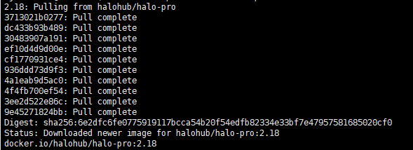 sudo docker pull halohub/halo-pro:2.18sudo固定命令,不能省略;docker pull固定命令,不能省略;halohub/halo-pro:2.18镜像全名,替换为自己需要的镜像全名。