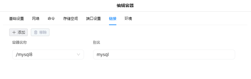 容器名称:选择已安装的MySQL;别名:为了便于使用直接定义为mysql。