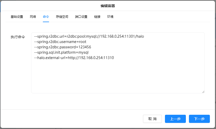 --spring.r2dbc.url=r2dbc:pool:mysql://{数据库所在宿主机的ip,不能是127.0.0.1、0.0.0.0、localhost}:{数据库“3306”对应的端口}/{halo数据库}