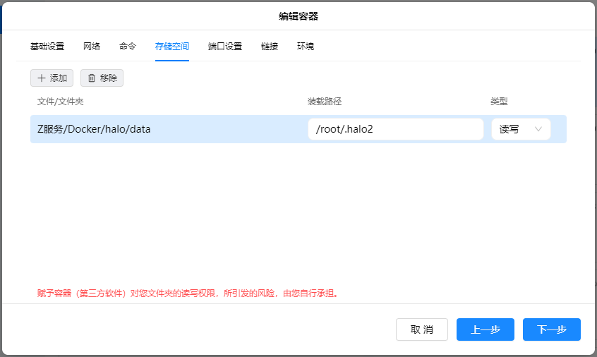 “/root/.halo2”:存放所有的数据文件,必须做映射,读写权限。
