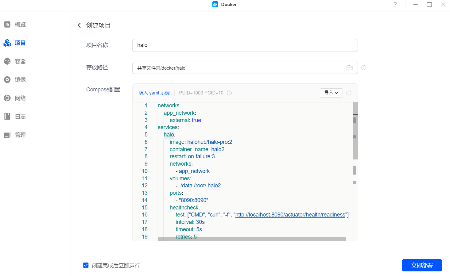 mysql和halo均使用app_network网络,注意不能是host网络;--spring.r2dbc.url=r2dbc:pool:mysql://mysql:3306/数据库名称:数据库名称需要使用phpmyadmin创建数据库并创建对应的账号和密码,此处填写对应的数据库名称;