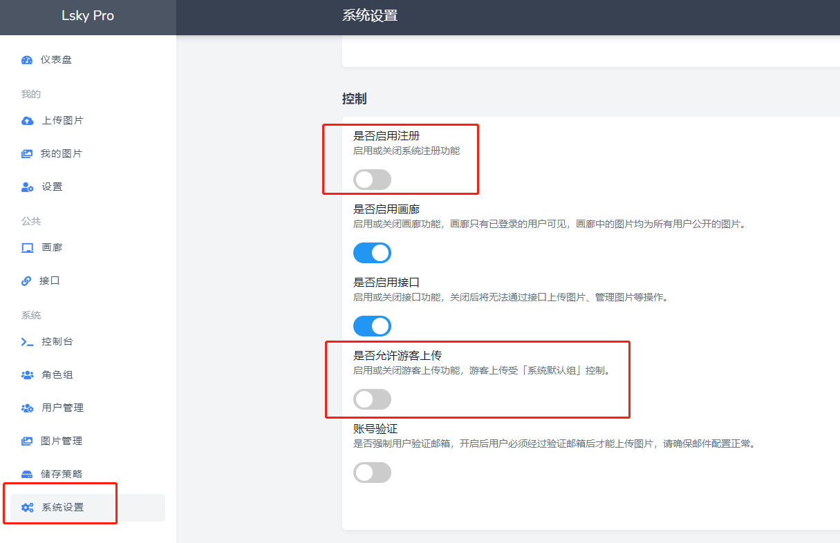 强烈建议在“系统设置”中关闭,“注册”以及“允许游客上传”功能,本程序支持图片审核,但需要使用第三方服务进行会涉及费用问题,所以不建议开启这类功能增加传播非法图片问题的发生。