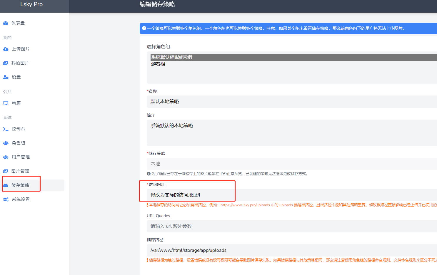 本地储存的访问网址必须有根路径,例如:https://www.lsky.pro/uploads 中的 uploads 就是根路径,且根路径不能和其他策略重复。修改根路径直接影响已经上传并已使用的链接的访问。