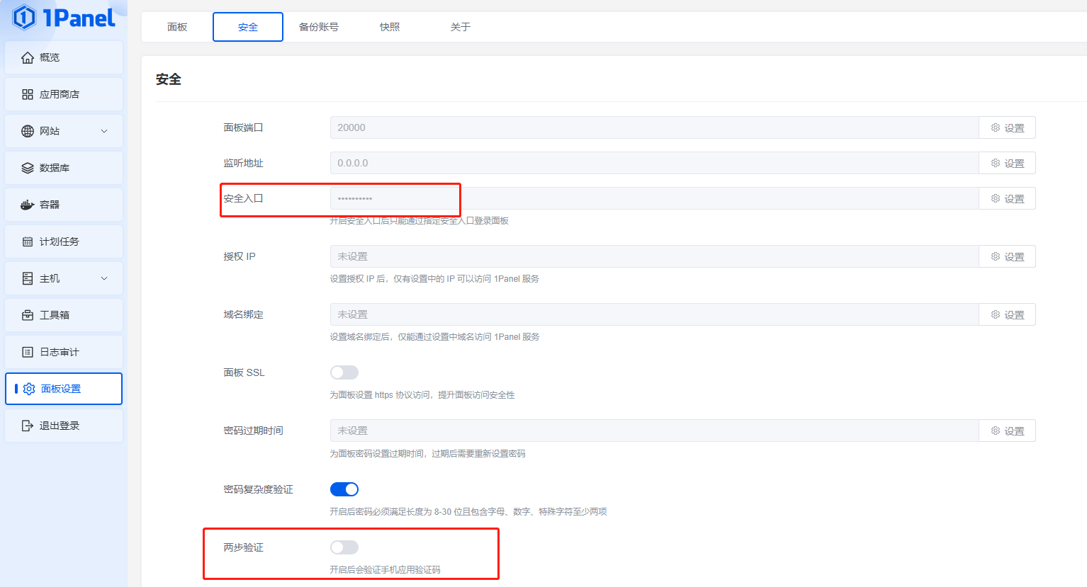 面板设置 - 安全中可以修改安全入口以及增加两步验证。