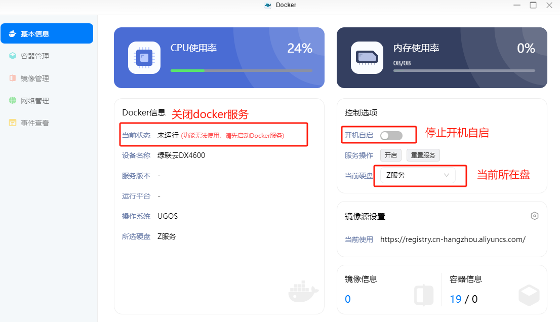 开机自启:关闭;停止docker服务;确认当前docker所在盘。