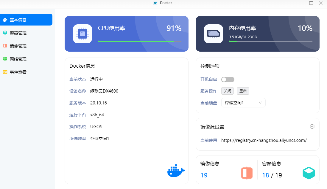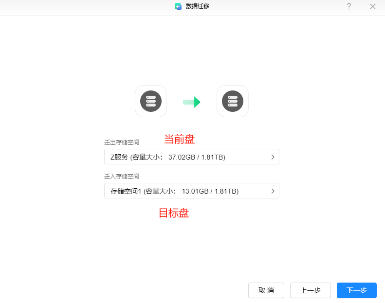 迁出存储空间:选择当前docker所在盘;迁入存储空间:选择目标docker运行盘;注意:须确保迁出硬盘使用空间小于迁入硬盘的总大小!