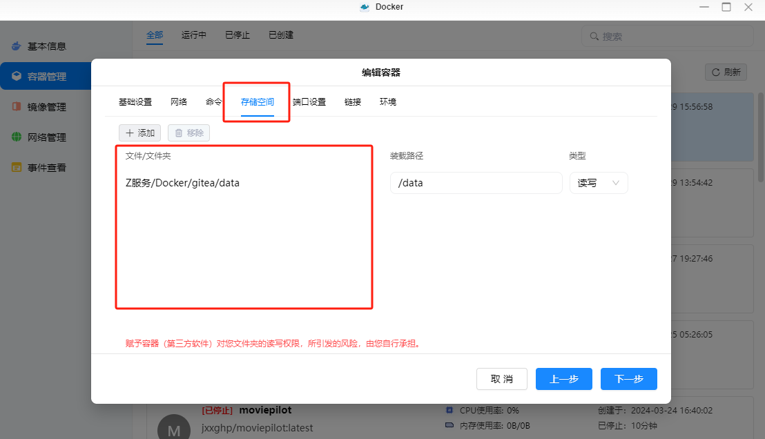 文件/文件夹修改为新的docker配置文件/文件夹;使用