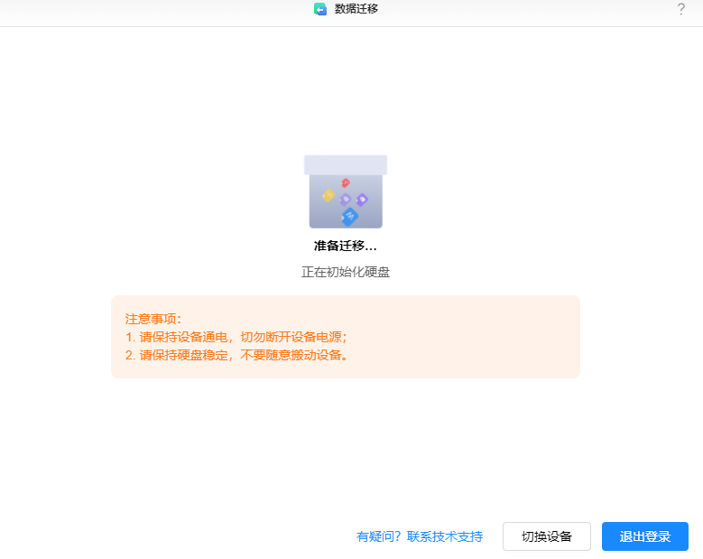 迁移完成须退出登录后重新连接设备!