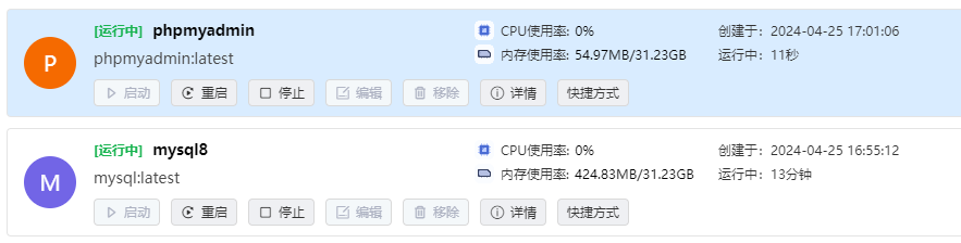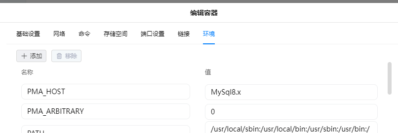 phpmyadmin容器的“环境”设置页中,MySQL主机地址的变量值就可以填写mysql或者mysql8,以此来表示MySQL的连接地址用于替代IP地址的写法。