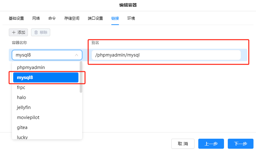 phpmyadmin容器的“链接”设置页中,选择添加:容器名称:容器选择安装好的MySQL,具体名称根据自己的MySQL容器安装时而定;别名:别名输入一个自己喜欢的名称,最好是字母开头不要带有特殊符号,可以使用数字结尾;注意:别名输入不需要”/”部分,只需要输入自己喜欢的名称,容器保存后会自动出现"