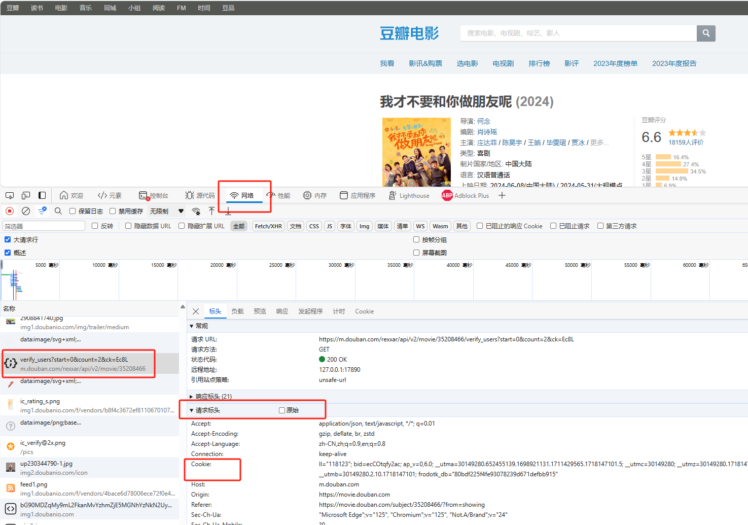 请求表头中找到Cookie字段,对应Cookie字段后的内容就是需要的豆瓣网站cookie,完整复制到插件的豆瓣网站cookie中,保存插件设置。