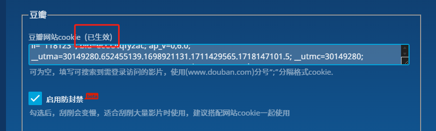 豆瓣网站cookie若显示:(已生效):表示cookie配置成功;(已失效):此时需要按照上述操作重新获取并填写cookie。