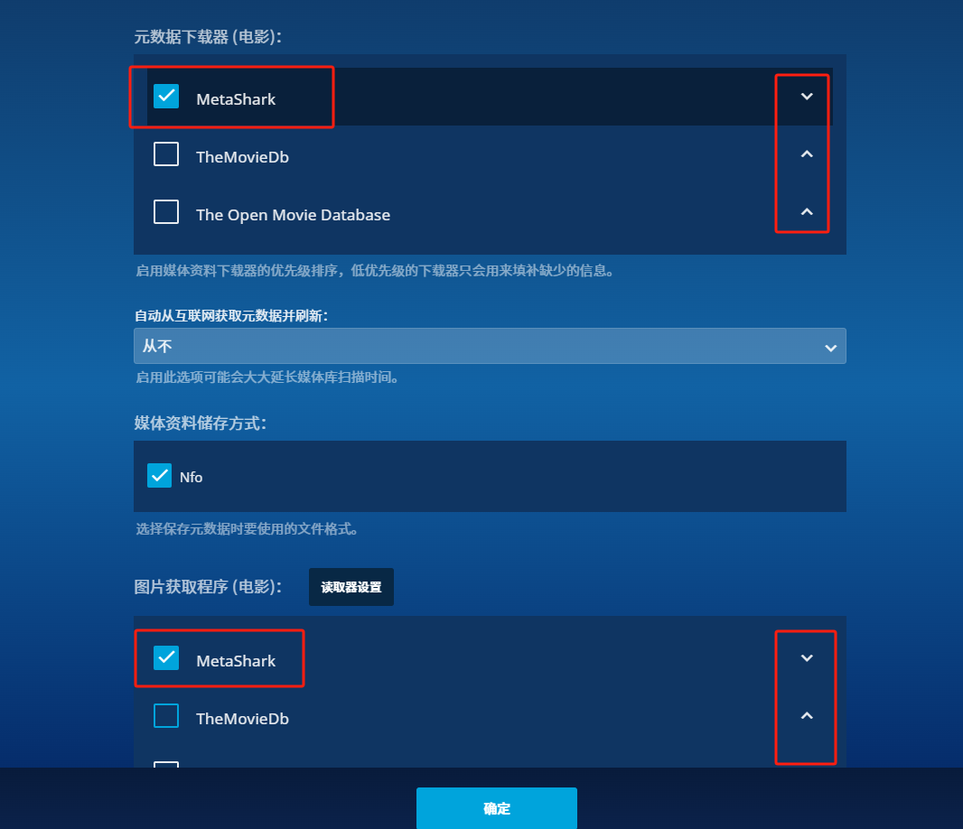 元数据、图片程序中启用MetaShark,并通过排序移动至第一位;其它刮削器均可选择关闭,也可以启用作为MetaShark失效时的备用选择。