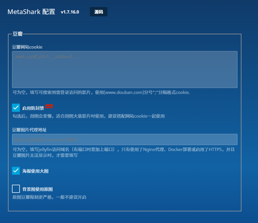 豆瓣网站cookie:一般不需要填写,如需填写可查看3.1、获取豆瓣cookie章节介绍;启用防封禁:必须开启,豆瓣存在拉取限制,一旦超出上限就会被封禁6小时,若被封禁,家庭带宽可以重启路由器更换动态公网ip来规避封禁;豆瓣图片代理地址:按需填写jellyfin的最终访问URL;海报使用大图:按需开启;背景图使用原图:不建议开启。