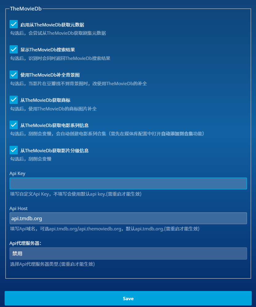 TMDB配置作为豆瓣缺少资源时的补充下载,可根据实际需要自行配置;Api Key:可在百度寻找如何申请,这里不在赘述;Api Host和Api代理服务器:按需配置。