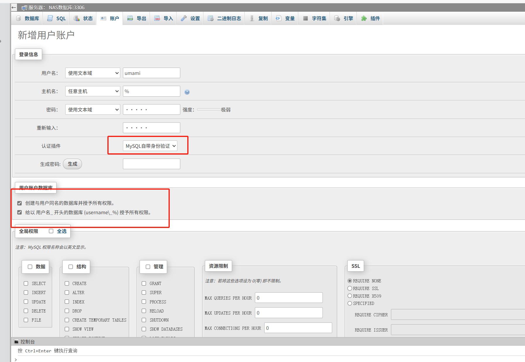 用户账户数据库:下方2个选项均勾选,自动创建同用户名的数据库并分配管理权限。