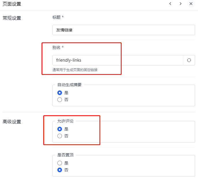 页面设置,标题填写友情链接,别名填写friendly-links用于访问,开启全站评论且开启当前页面评论,点击发布页面。